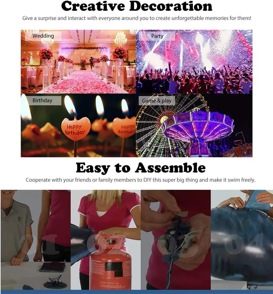note: Inflatable sharks are filled with helium gas. Helium gas is provided in flower shops, 4S shops, and car wash shops. Due to transportation reasons, the package does not contain gas.